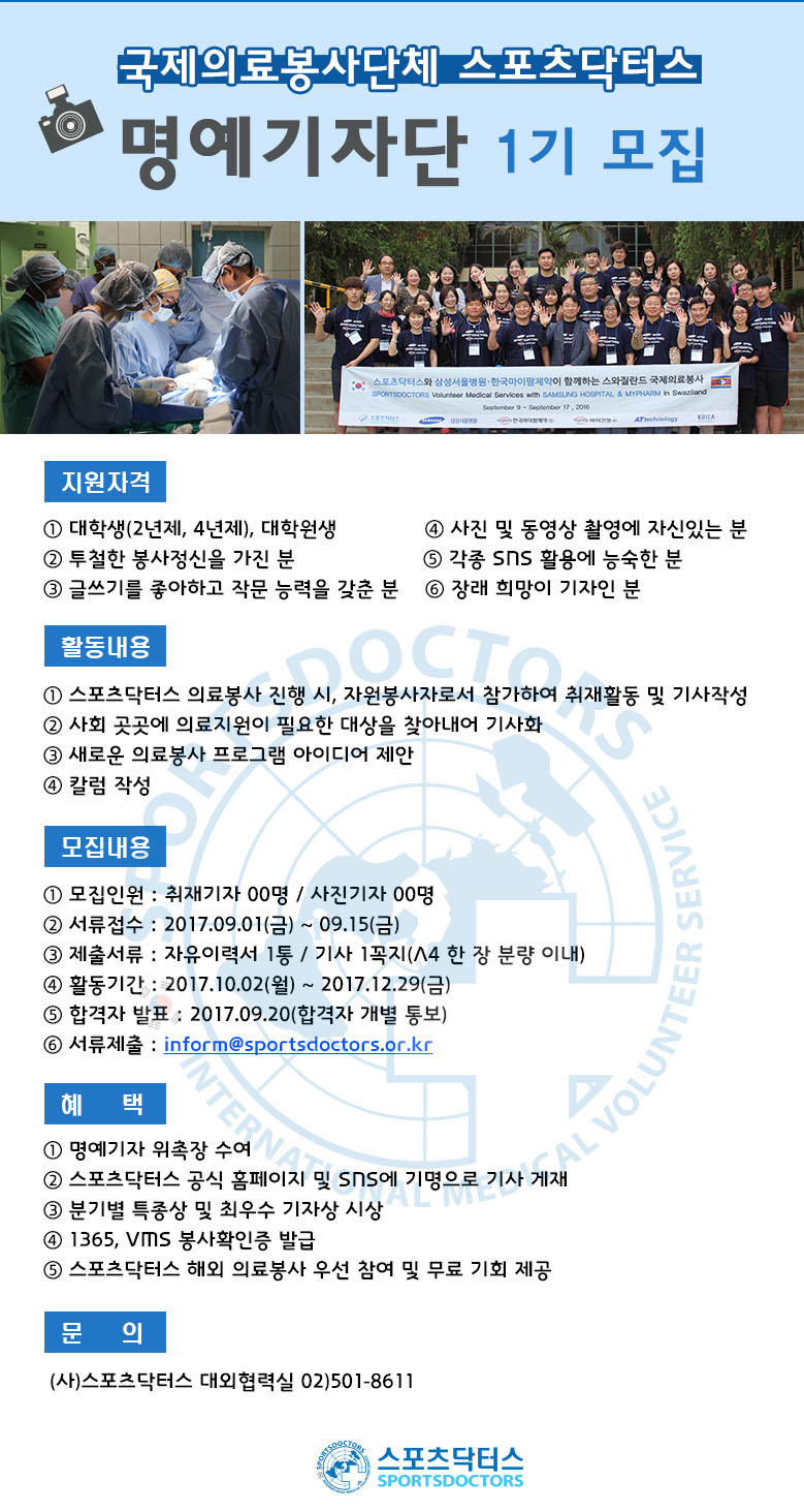 이번에 선발되는 스포츠닥터스 대학생 명예기자는 2017년 10월 2일부터 12월 말까지 활동하게 되며, 스포츠닥터스의 의료봉사활동을 취재하고 SNS를 통해 이를 전달하는 통신원 역할을 담당한다.