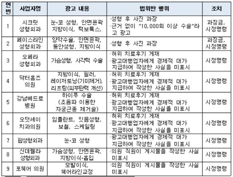 위반 의료기관은 6개 성형외과(시크릿, 페이스라인, 오페라, 닥터홈즈, 팝, 신데렐라)와 1개 치과(오딧세이), 1개 산부인과(강남베드로), 1개 모발이식병원(포헤어) 이다.