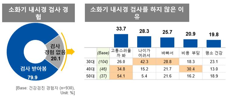 서울, 경기, 인천, 부산, 대구, 광주, 대전에 거주하는 30세 이상 59세 이하 남녀 성인 1,000명을 대상으로 온라인으로 진행된 이번 설문 결과, 건강검진을 받은 적 있는 930명 중 20.1%는 소화기 내시경 검사를 한 번도 받지 않은 것으로 나타났다.