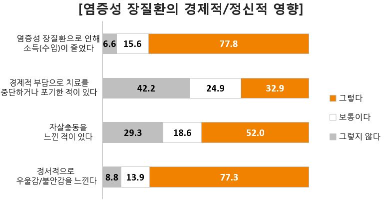 이외 염증성 장질환 환자들은 질환으로 인한 정신적 고충도 커서 정서적으로 우울감/불안감을 느낀다는 응답이 77.3%, 자살 충동을 느낀 적이 있다는 응답도 52.0%에 달할 정도로 매우 높게 나타났다.