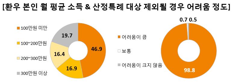 가구 월 평균 소득 역시 399만원 이하인 가정이 전체의 66.0%를 차지했는데, 이는 도시 근로자 가구 당 월 평균 소득 약 442만원 보다 낮은 수치다. 원래 소득 수준이 낮은 것에 더해 전체 응답자의 77.8%는 질환으로 인해 소득이 줄어 부담을 더 키우고 있었다.