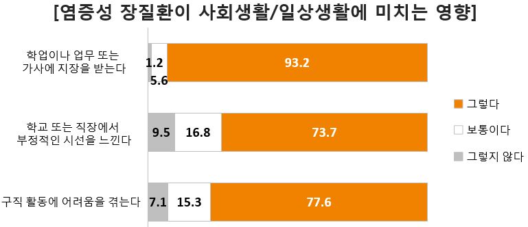 염증성 장질환은 환자들의 사회생활과 일상생활에도 큰 영향을 미쳤다. 93.2%가 질환으로 인해 학업이나 업무, 가사 등에 지장을 받는다고 응답한 가운데, 학교 또는 직장에서 부정적인 시선을 느낀다는 응답이 73.7%로 주변 사람들의 오해나 편견 해소가 시급한 것으로 나타났다.