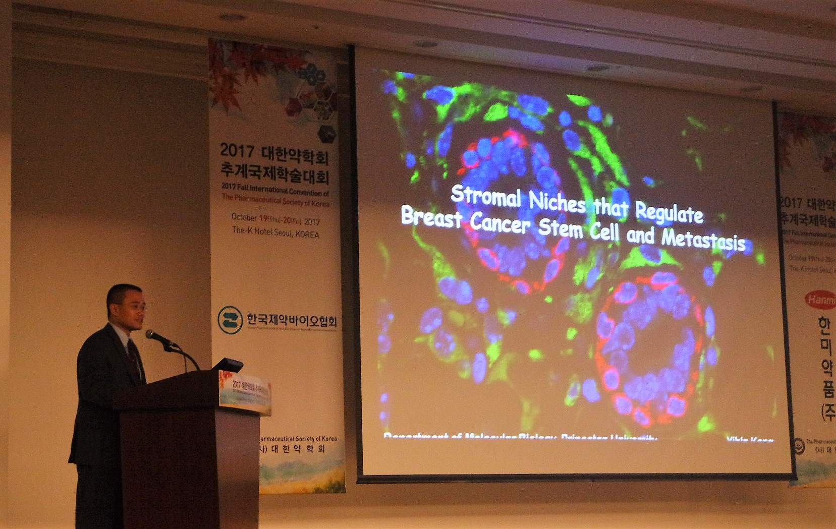 19일 열린 대한약학회 학술대회에서는 이빈 강(Yibin Kang) 교수(미국 프린스턴대학)가 ‘유방암 줄기세포와 전이를 조절하는 기질조직 니쉬’라는 주제로 발표를 진행했다.