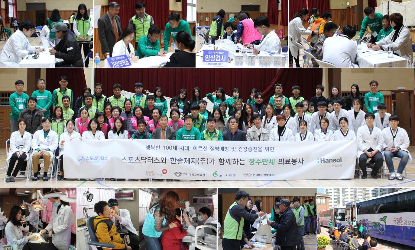 국제의료봉사단체 스포츠닥터스(이사장 허준영, 한국마이팜제약/마이건설/마이디자인 회장)는 지난 11일 한솔제지와 충남 서천군 장항읍에 위치한 충남조선공업고등학교 체육관에서 ‘장수만세 의료봉사’를 진행했다.
