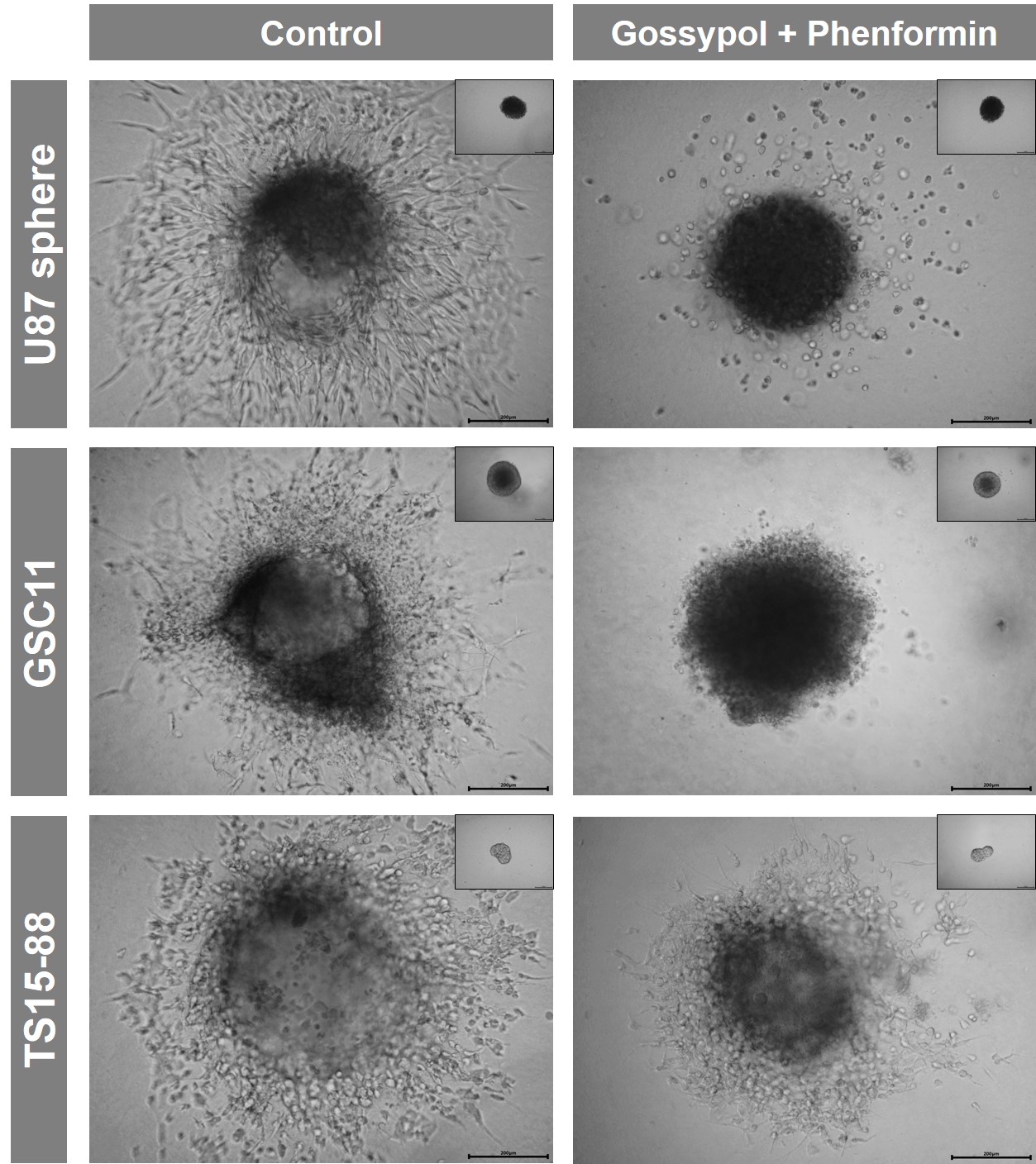아무런 치료를 하지 않는 교모세포종 이식 마우스의 경우 생존기간이 평균 42일이었지만 고시폴과 펜포르민을 함께 투여했을 때 생존기간은 50% 이상 늘어난 62.5일이었다. 고시폴(53.5일)이나 펜포르민(50.5일)만 단독 투여한 경우 대조군에 비해 생존율 향상 효과는 있었으나 크지 않았다.