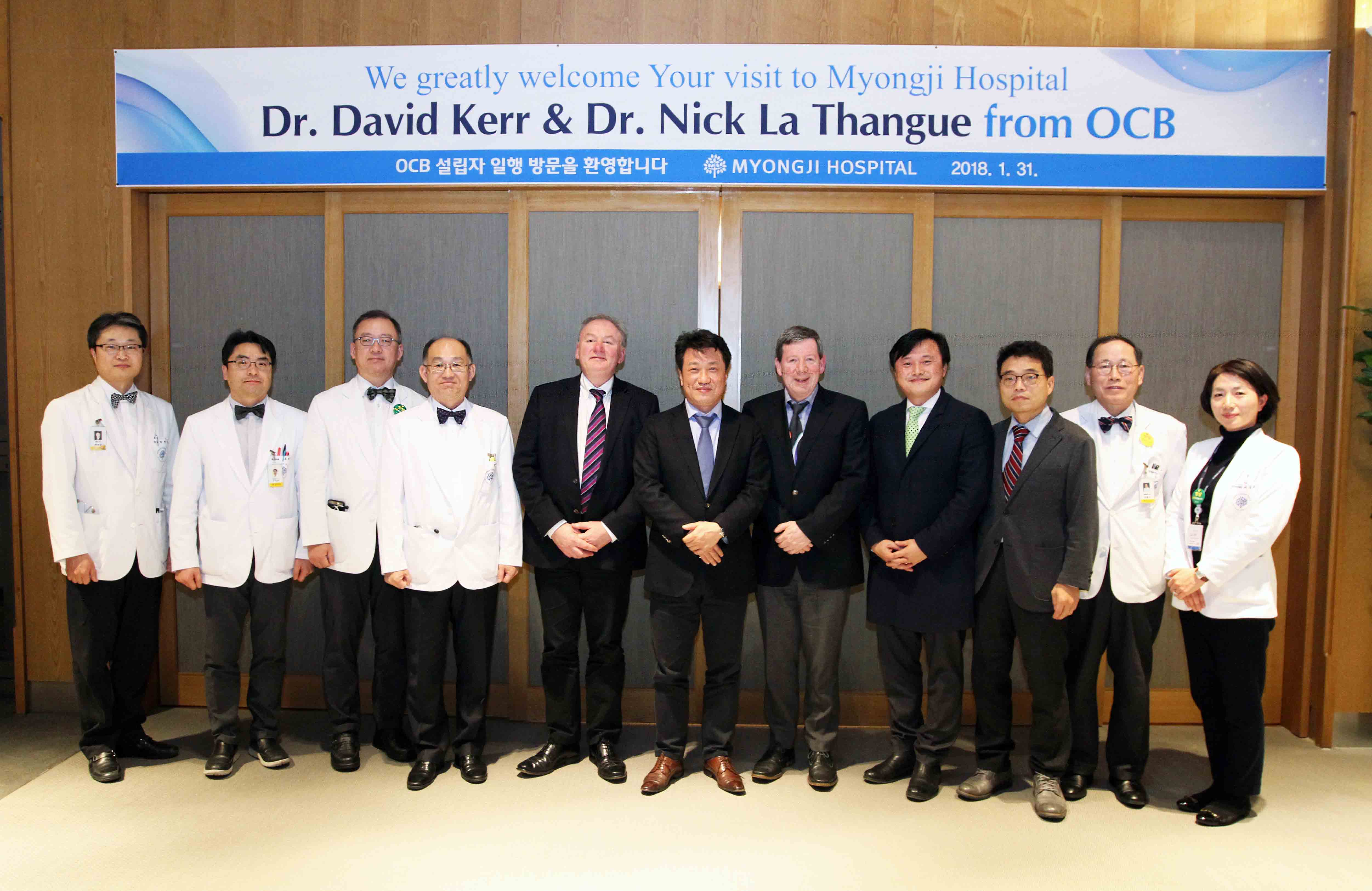 이어 이왕준 이사장은 최근 영국 바이오 기업 옥스퍼드 캔서 바이오마커스(OCB; Oxford Cancer Biomarkers)사의 설립자인 Nick La Thangue 박사와 David Kerr 박사와 만나 명지병원과 OCB, 그리고 캔서롭 간 공동연구 및 협력 등에 대한 긴밀한 논의를 가졌다.