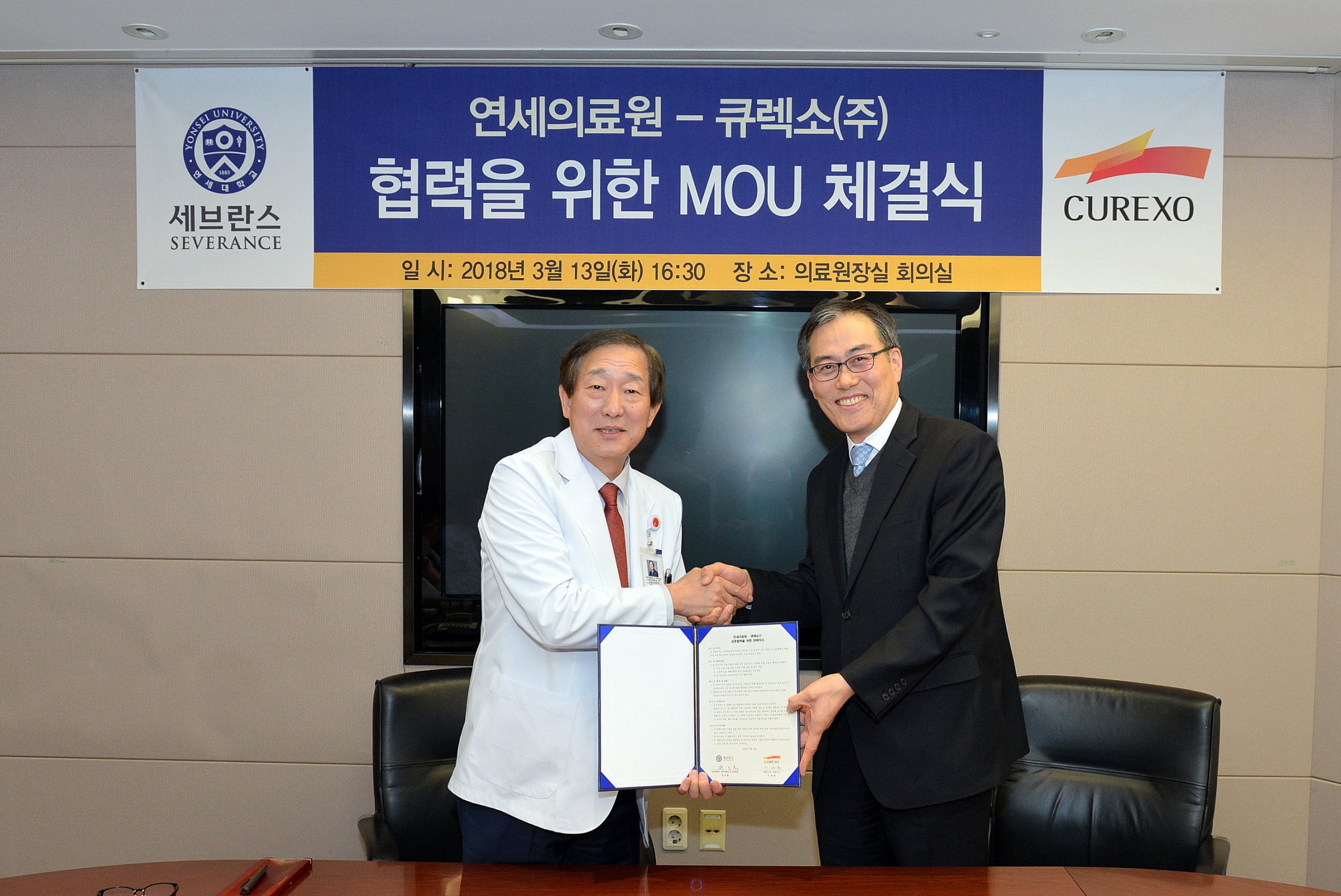 이번 협약식은 윤도흠 연세의료원장과 이재준 큐렉소 대표 등이 참석했고, 두 기관은 협약을 통해 신경외과 및 재활의학과를 포함한 다양한 분야에서 의료로봇의 연구개발 및 도입에 지속해서 협력할 예정이다.