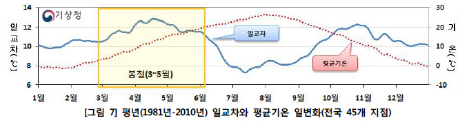 연중 일교차가 가장 큰 계절은 봄으로, 특히 4월에 가장 크게 나타난다. 실제로 기상청에 따르면 4월 평균 기온은 11.8~12.6℃로 포근하다고 느낄 수 있으나, 이동성 고기압과 대륙고기압의 영향을 주기적으로 받아 20도 안팎으로 일교차가 크다.