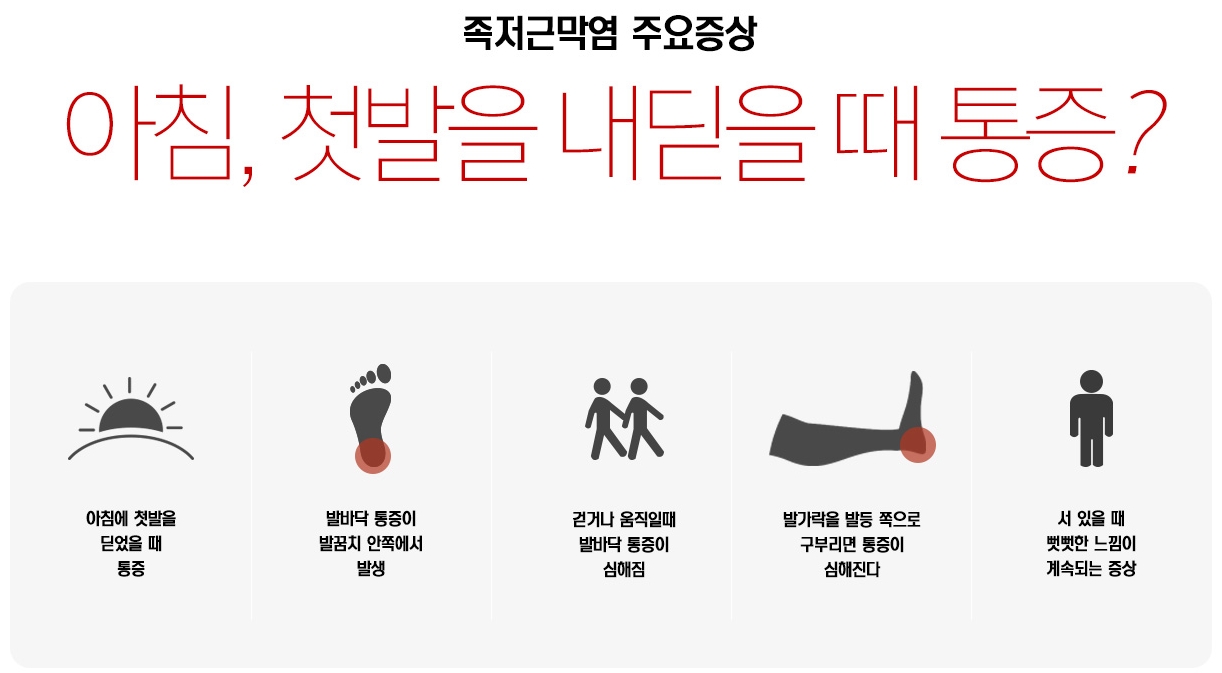족저근막염이 발생하면 걸을 때마다 발바닥에 찌릿찌릿한 통증이 나타난다. 아침에 일어나 첫 발을 내디딜 때 가장 심한 통증을 느낀다. 이 통증은 시간이 지나면 점차 증상이 완화되지만 이후에도 발바닥이 찢어지는 듯한 고통이 반복된다. 아침, 그리고 활동량이 늘어나는 오후 시간에 다시 통증이 나타나는 경우가 많다.