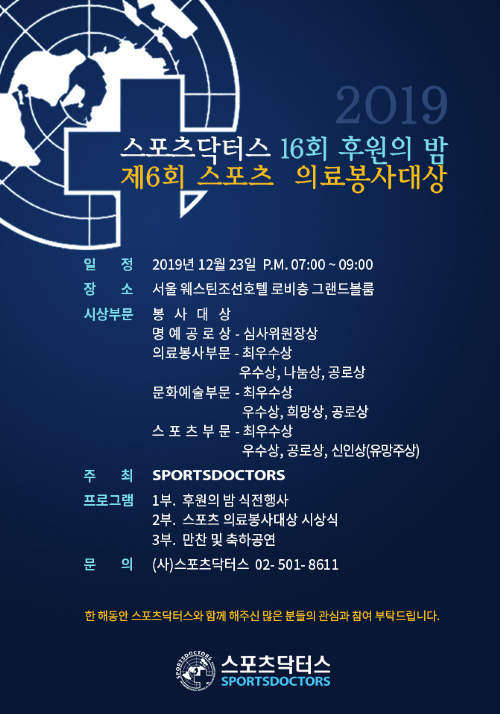 국제보건의료 단체 스포츠닥터스(이사장 허준영 마이그룹/한국마이팜제약/ 마이건설/ 마이디자인/ 인터메디컬데일리 회장)는 12월 23일 오후 7시 서울 웨스틴조선호텔 그랜드볼룸에서 ‘2019 후원의 밤 및 제6회 스포츠 의료봉사대상’ 시상식을 개최한다.