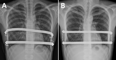 정 교수팀은 2011년 9월부터 2016년 1월까지 2개의 금속막대를 삽입한 너스수술 환자 86명을 교정 막대의 양쪽 측면을 각각 고정한 A군(44명, 사진A)과 각 교정 막대를 세로형 막대와 연결해 사각형 형태로 고정 시킨 B군(42명, 사진B)으로 나눴다.