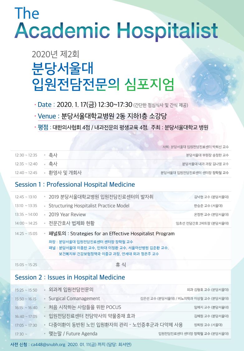 분당서울대병원이 오는 1월 17일(금) 오후 12시 30분, 분당서울대병원 소강당에서 ‘제2회 입원전담전문의 심포지엄(The Academic Hospitalist)’을 개최한다.