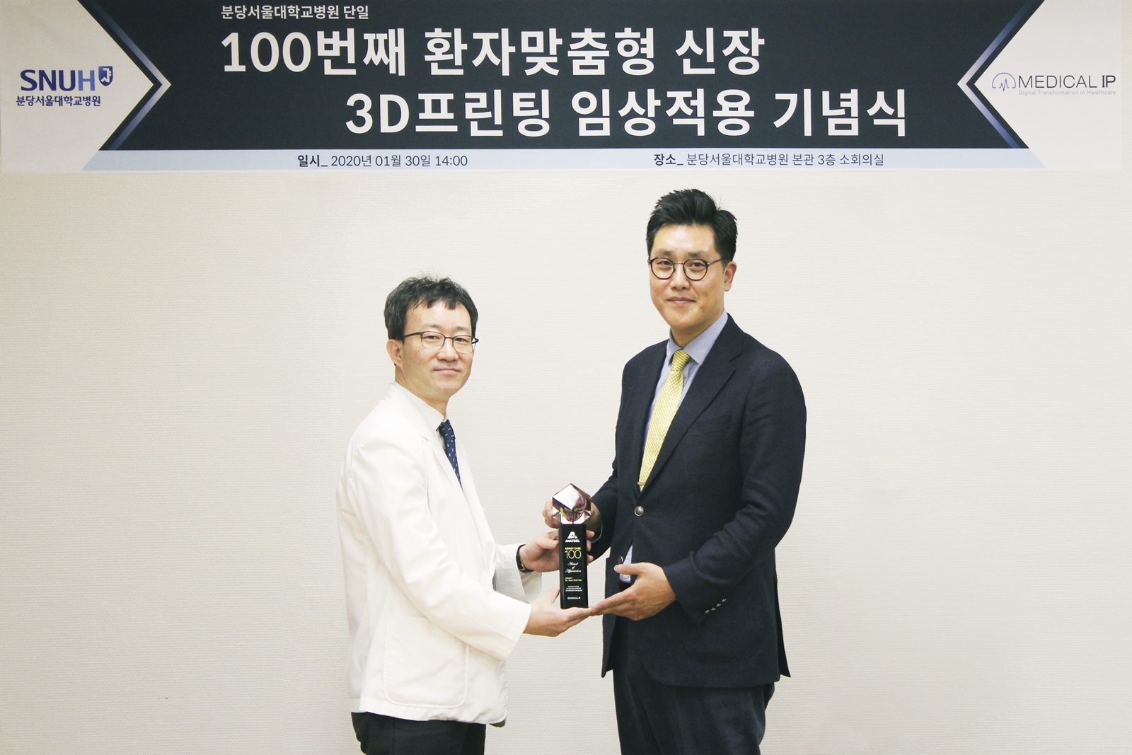 분당서울대병원과 메디컬아이피의 ‘환자맞춤형 3D프린팅 신장’ 100번째 임상적용을 기념하기 위해 마련된 이번 행사에는 분당서울대병원 비뇨의학과장 변석수 교수, 메디컬아이피 박상준 대표이사 등이 참석했다.