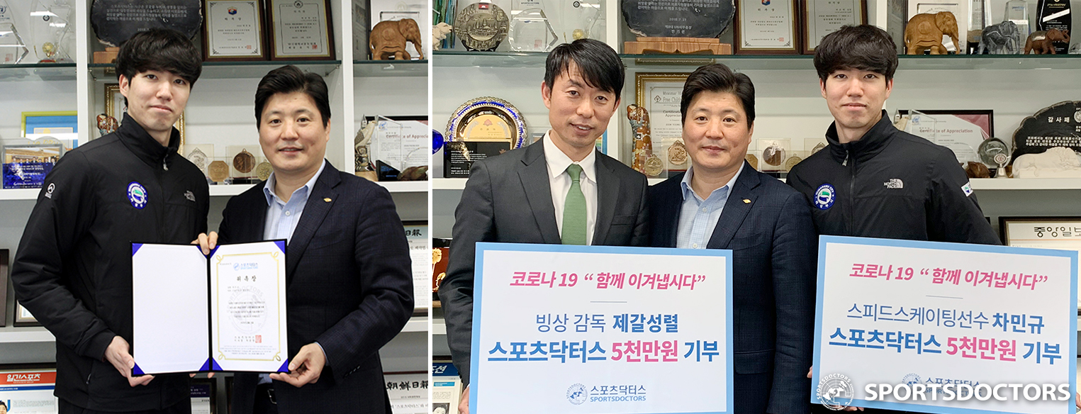 국제보건의료단체 스포츠닥터스(이사장 허준영 마이그룹/한국마이팜제약/ 마이건설/ 마이디자인/ 인터메디컬데일리 회장)는 제갈성렬 의정부시청 빙상팀 감독과 평창올림픽 은메달리스트 차민규 선수(의정부시청)가 코로나19 확산 방지 의약품 후원에 써달라며 각 5천만원 씩을 전해왔다고 18일 밝혔다.