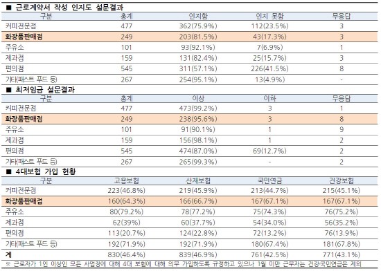 조사항목은 △근로계약서 작성 △최저임금 △4대보험 △초과근무수당 △주휴수당에 대한 인지도 등으로 근로기준법에서 기본적으로 보장하도록 되어 있는 항목이었다.