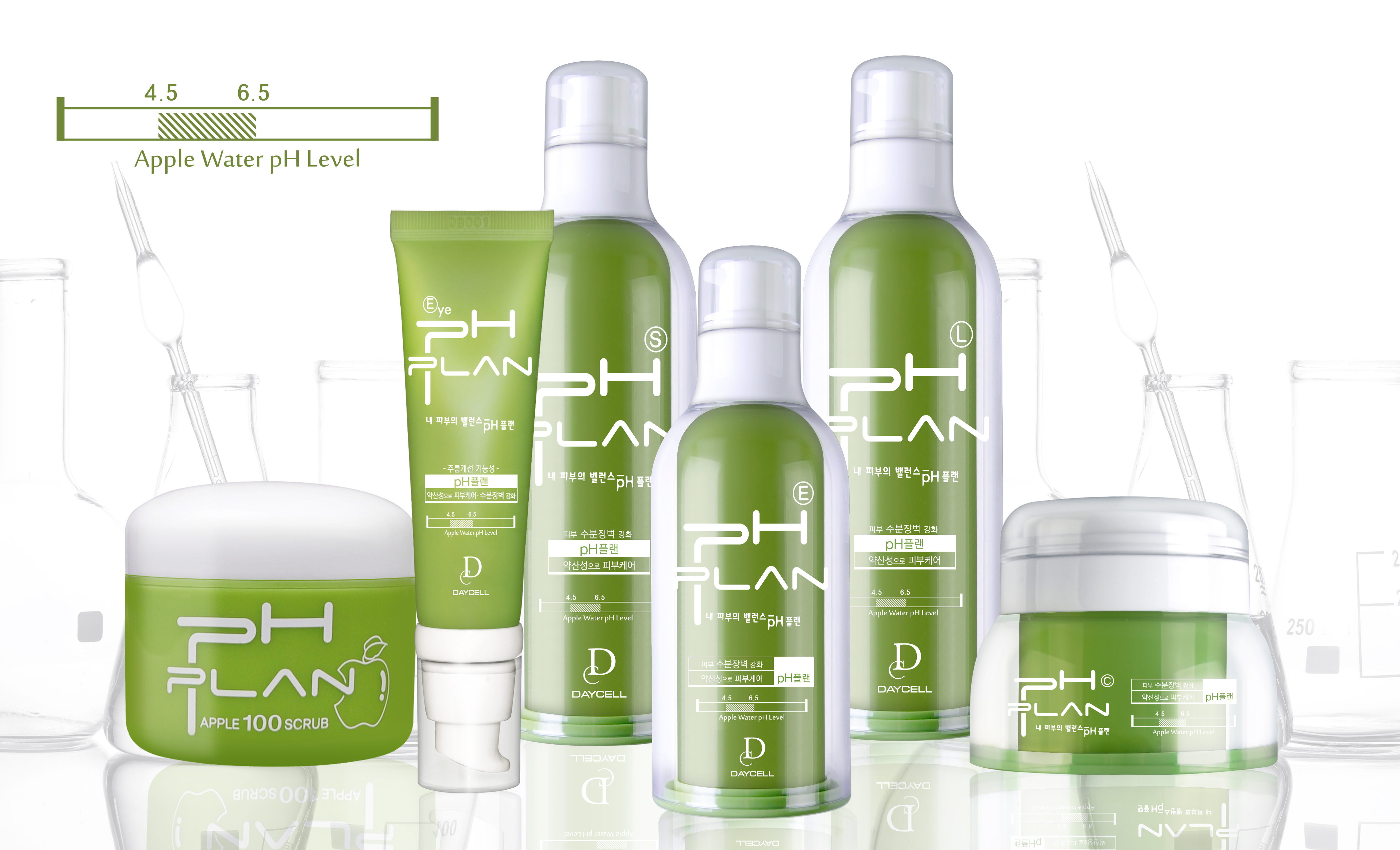 약국화장품 데이셀코스메틱의 pH플랜은 저자극 약산성라인으로 알칼리화 된 피부를 적정 pH를 유지시켜 약산성 피부상태로 돌이켜주는데 도움을 준다. 뿐만 아니라 정제수를 자연유래 사과수로 100% 대체해 피부 수분을 보충하여 촉촉하고 탱탱하게 만들어주는 약산성 화장품이다.