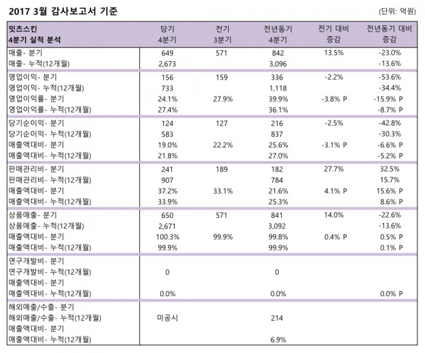 감사보고서에 따르면 잇츠스킨의 2016년 4분기 매출은 3분기에 비해 77억원이 증가했으나 전년 동기(842억원) 대비 194억원이 감소(-23.0%)했다. 또 4분기 영업이익은 156억원으로 3분기 대비 3억원, 전년 동기 대비 180억원이 감소했다. 이에 따라 2016년 전체 영업이익은 733억원으로 전년(1118억원) 대비 34.4% 하락했다.