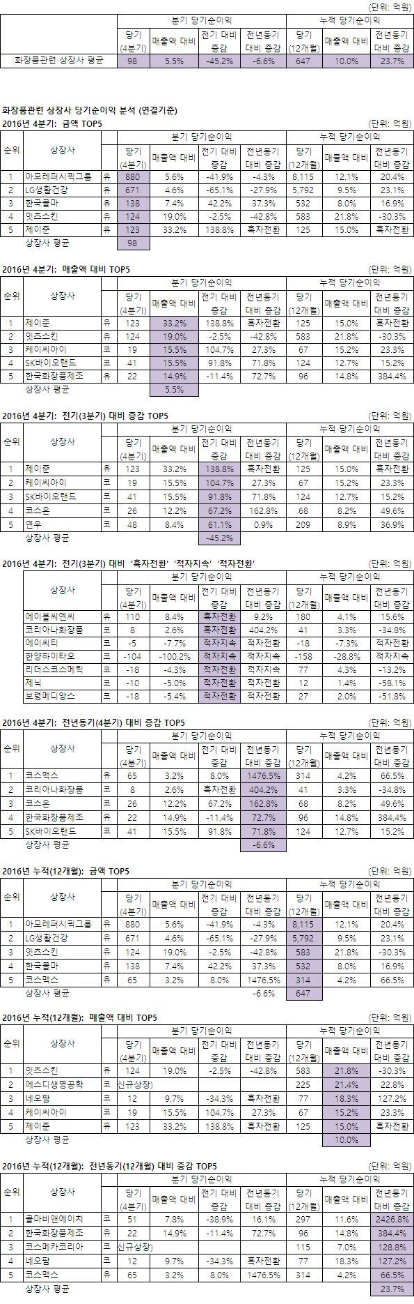 분기 기준 금액 1위는 880억원의 아모레퍼시픽그룹이 차지했다. 마스크팩 전문기업 제이준은 33.2%의 매출액 대비 순이익률로 1위에 올랐다. 전기 대비 순이익이 가장 많이 증가한 곳도 138.8% 오른 제이준이었다. 전년 동기 대비 증가율 1위는 1476.5% 급증한 코스맥스가 차지했다.