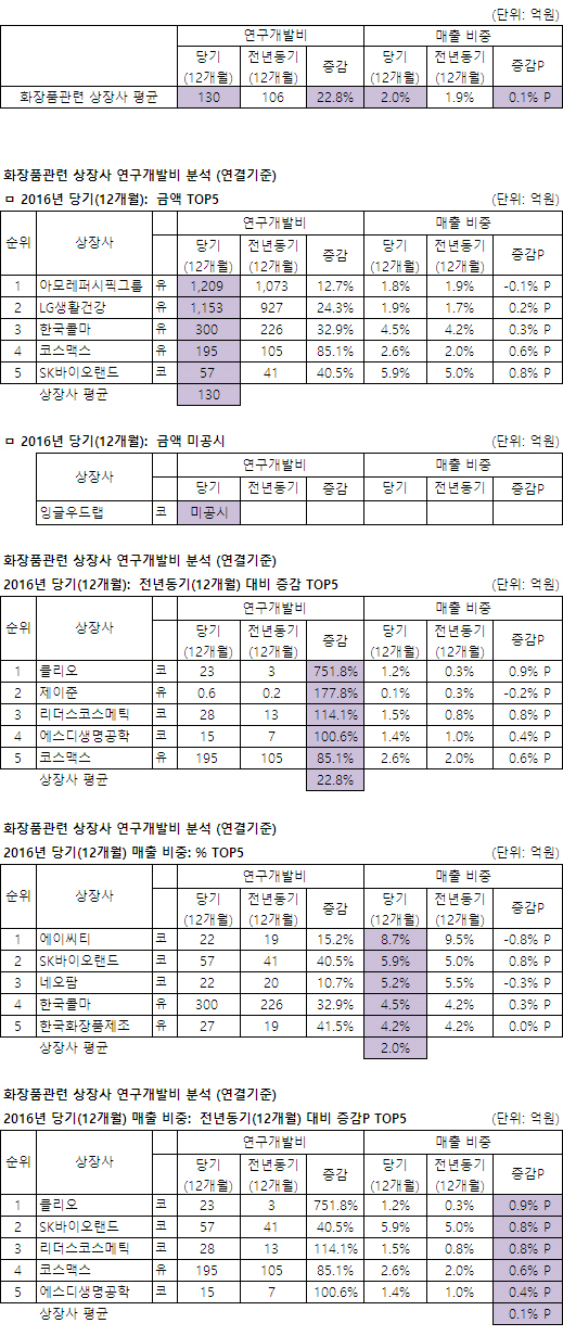 뷰티누리(화장품신문)닷컴과 약업닷컴이 국내 화장품관련 17개 상장사(코스피 10개사·코스닥 17개사)의 2016년도 연구개발비를 분석했다. <편집자 주>
