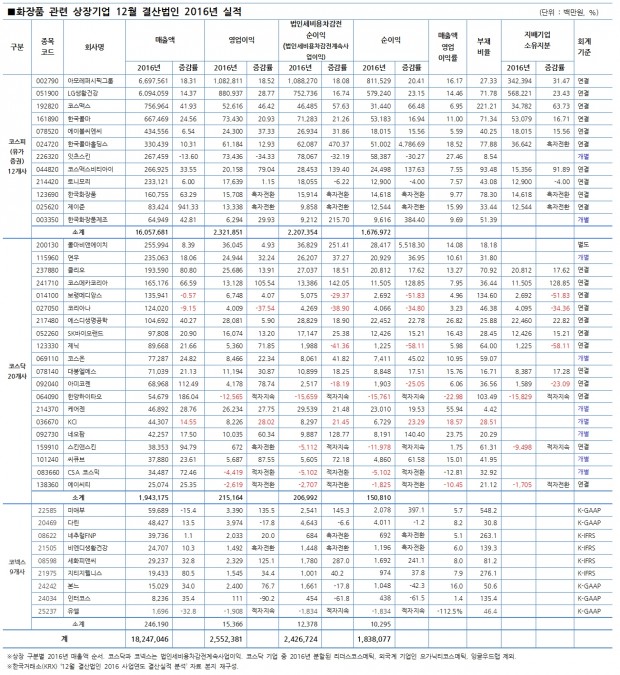한국화장품도 크게 성장했다. 매출은 2015년 984억원에서 2016년 1608억원으로 증감률은 63.29%다. 코스피 12월 결산 상장법인은 모두 725개사.