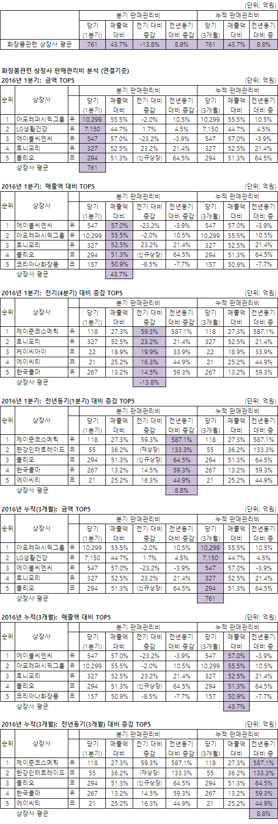 금액 부문은 아모레퍼시픽이 1위를 차지했고 매출액 대비 비중 부문은 에이블씨엔씨가 수위에 올랐다. 전기(16년 4분기) 및 전년 동기 대비 가장 높은 상승률은 보인 곳은 마스크팩 전문기업 제이준코스메틱이었다. <편집자 주>