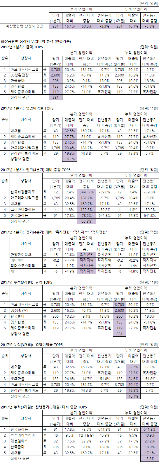 올 1분기 27개 국내 화장품 관련 상장사의 평균 영업이익은 281억원으로 전년 동기에 비해 3.3% 하락했지만 전기(16년 4분기)보다 60.8% 증가했다.