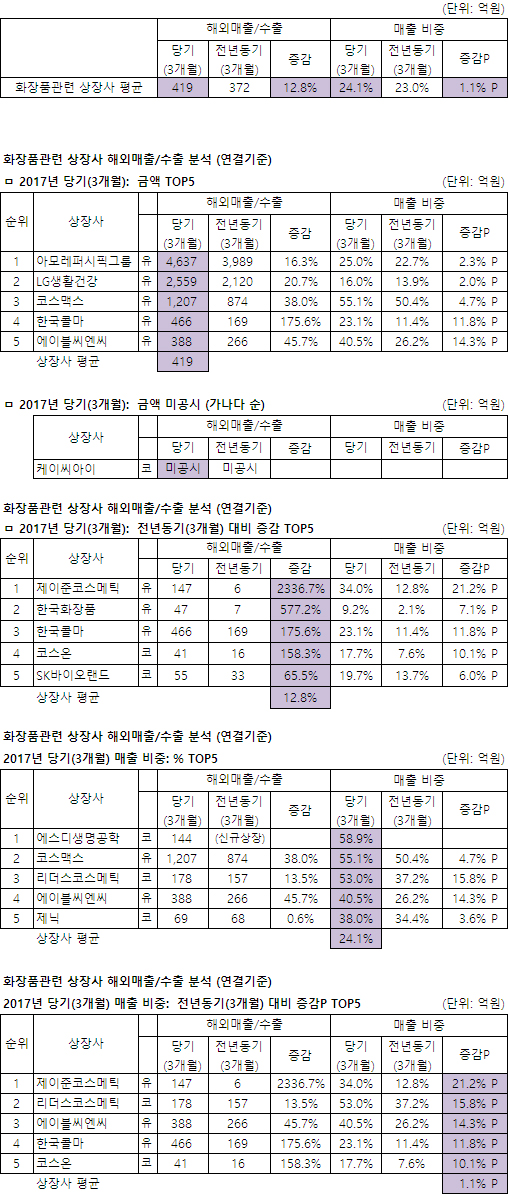 뷰티누리(화장품신문)닷컴과 약업닷컴이 국내 27개 화장품 관련 상장사(코스피 10개사·코스닥 17개사)의 1분기 해외매출/수출 실적(연결 기준)을 분석했다.