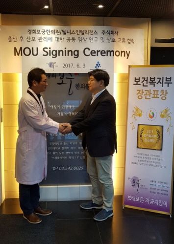 웰니스인텔리전스(대표 서동필)와 경희보궁한의원(대표원장 박성우)은 출산 후 산모 관리에 대한 공동 임상 연구 및 상호 교류 협력에 관한 업무 제휴 협약을 체결했다고 지난 16일 밝혔다.