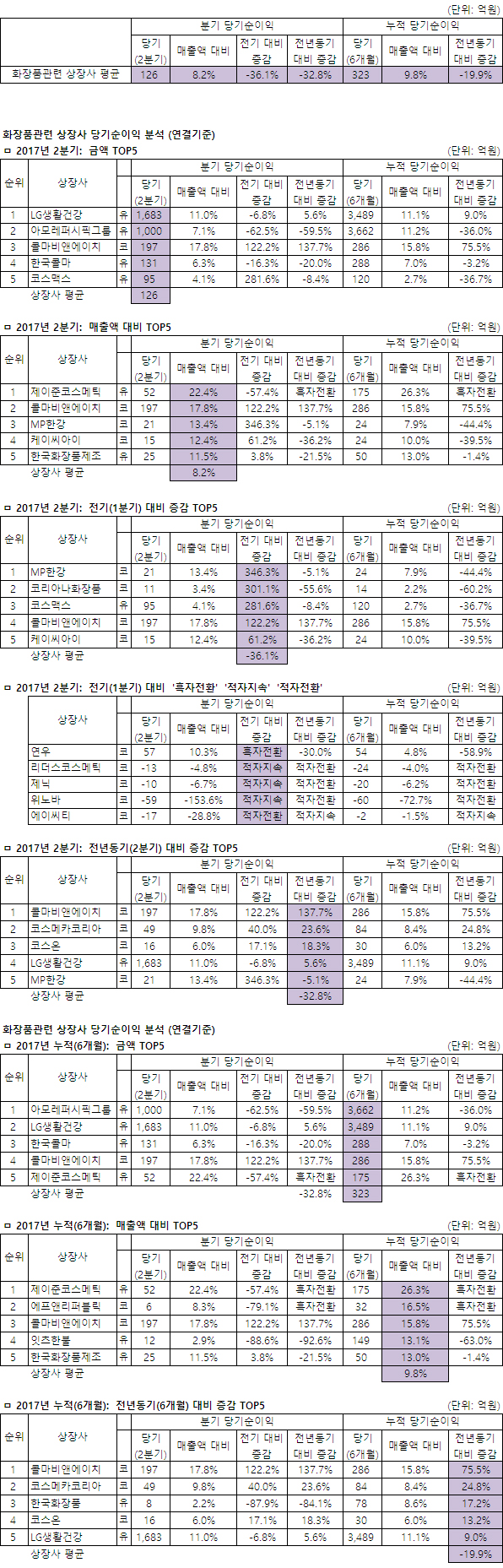 뷰티누리(화장품신문)닷컴과 약업닷컴이 국내 27개 화장품 상장사(코스피 10개사·코스닥 17개사)의 2분기 순이익(연결기준)을 분석했다.