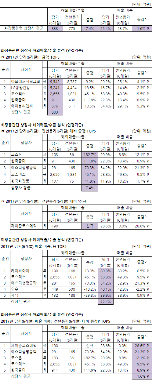 올 상반기 국내 상장 화장품기업의 나라 밖 성적은 어떨까.