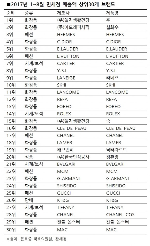 면세점에서 가장 많이 팔린 물품은 2013년 명품 의류에서 2017년 현재 화장품으로 바뀌었다. 당초 2014년까지 매출액 1위는 루이비통이었지만 2015년부터 올해까지 3년간 설화수, 후가 번갈아 1, 2위를 차지하고 있다. 화장품 판매실적은 지속적인 증가 추세로, 올해 8월까지의 매출액 상위 30위 브랜드 중 18개를 화장품 브랜드가 석권했다.