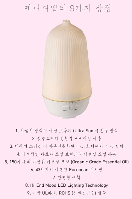 제니 디엘의 초음파 아로마 디퓨저는 초음파 진동 원리로 수증기를 발생시켜 작동하는 가습기 형태의 아로마 디퓨저로 향초의 화재 발생과 미세먼지 발생 위험이 없으며 동시에 디퓨저 향의 지속성까지 해결했으며, 모든 제품의 케이스는 친환경 P.P 소재로 만들어졌기에 안심하고 아로마 테라피를 체험할 수 있다.
