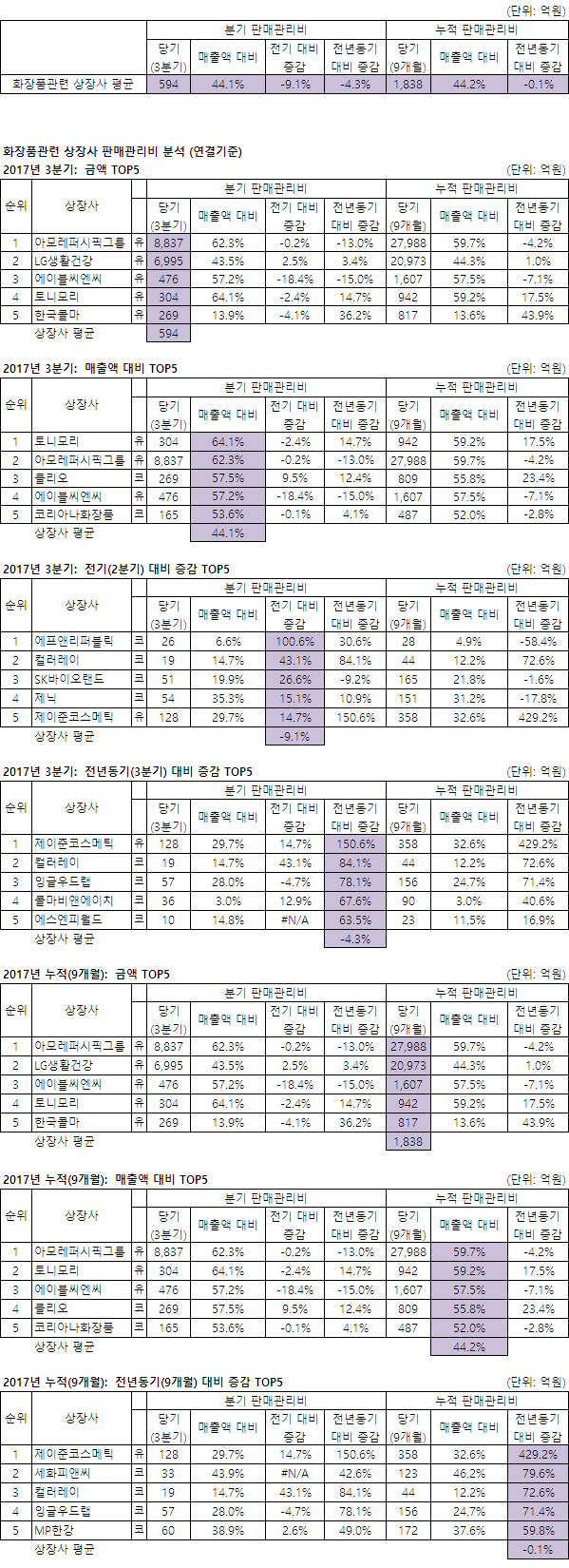 32개사의 3분기 평균 매출액 대비 평균 판매관리비 비중은 44.1%를 기록했다. 2분기 3위였던 토니모리가 64.1% 비중으로 1위에 올랐다. 아모레퍼시픽그룹은 62.3%로 2위를 차지했다. 57.5%를 기록한 클리오는 57.2%를 기록한 에이블씨엔씨를 근소한 차이로 앞서며 3위를 차지했다. 53.6%를 기록한 코리아나화장품은 5위였다.