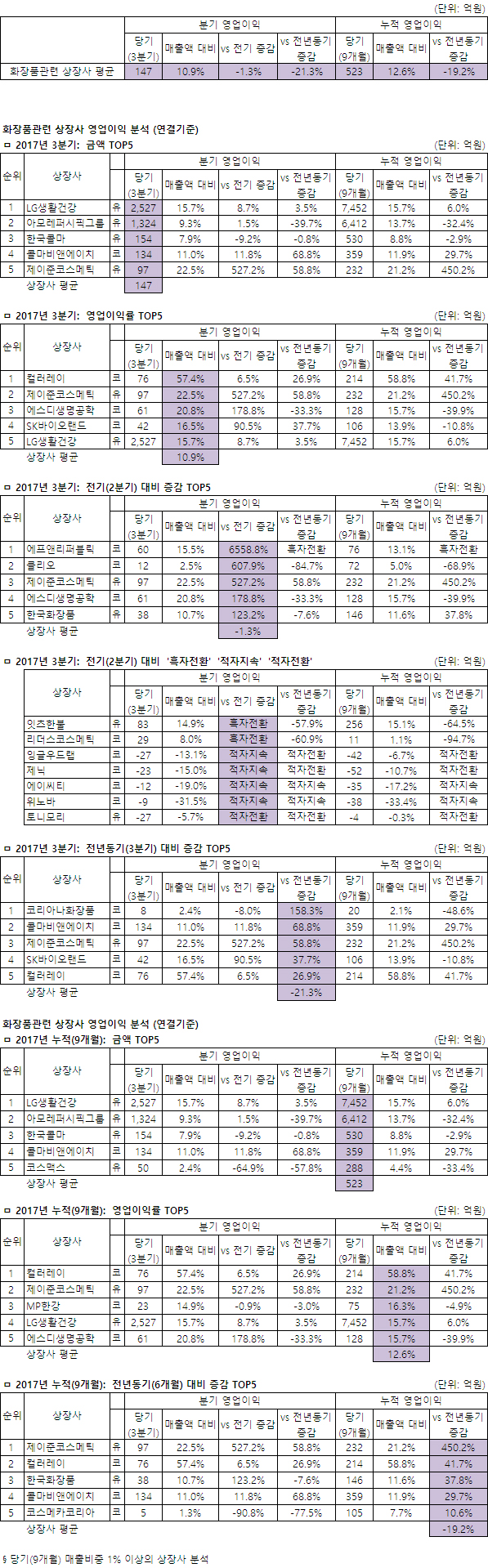 5위 한국화장품은 123.2% 증가했다. 판매관리비 19억원이 줄어 전기보다 21억원 상승했다.