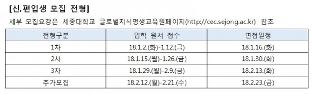 이번 신·편입생 모집과 관련해 보다 자세한 사항은 세종대학교 글로벌 지식 평생교육원 홈페이지(http://cec.sejong.ac.kr)에서 확인 가능하다. 원서접수 관련 문의는 02-6953-2617, 010-8485-8588, beautyon@sejong.ac.kr으로 하면 된다.