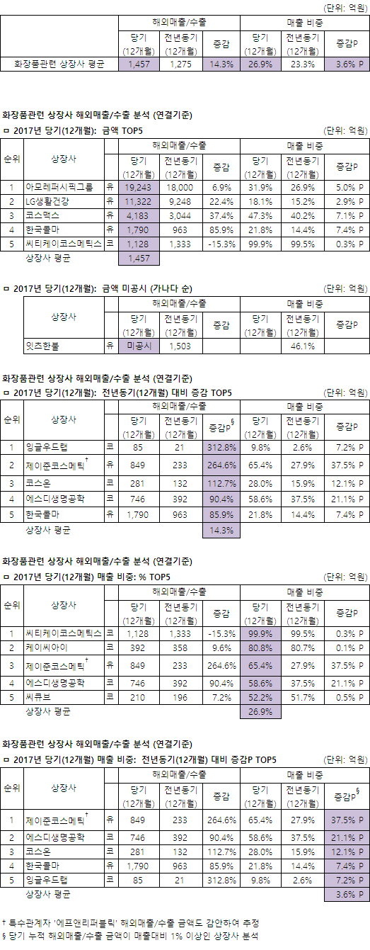 33개사의 2017년 누적 평균 해외매출/수출은 1457억원이었다. 1위는 1조9243억원을 기록한 아모레퍼시픽그룹으로 전년 대비 1242억원 증가했다. 중국을 포함한 아시아 매출이 1965억원 늘어났다. 2위 LG생활건강은 22.4% 상승한 1조1322억원의 실적을 올렸다. 역대 최고 기록이다. 전년 대비 2074억원이 증가했는데 세부적으로는 중국이 972억원, 기타 아시아 지역이 783억원 증가했다.