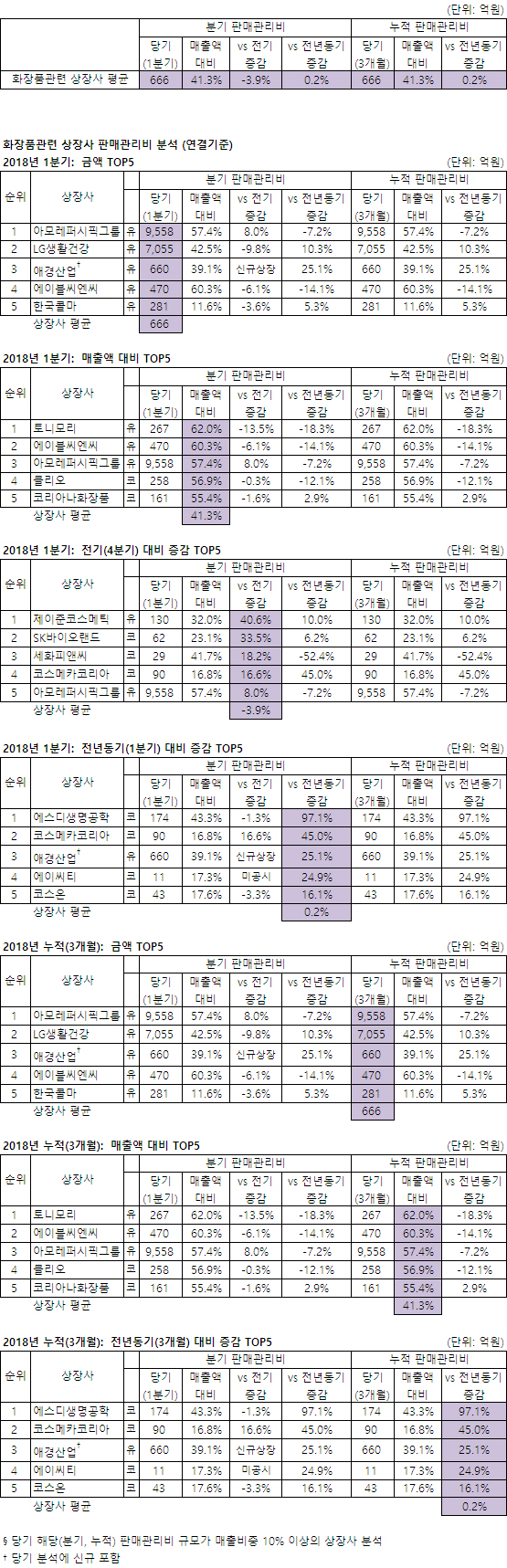31개사의 올해 1분기 평균 판매관리비는 666억원으로 전년 동기보다 0.2% 증가했다. 전기(2017년 4분기)와 비교하면 토니모리와 잇츠한불이 빠지고 애경산업과 한국콜마가 새롭게 톱5에 진입했다.