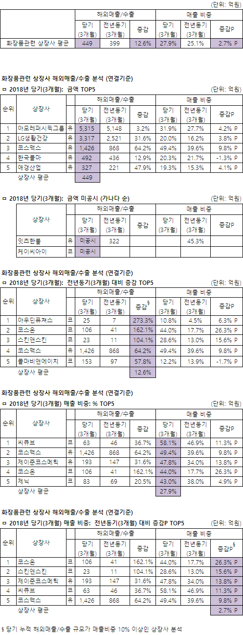31개사의 2018년 1분기 누적 평균 해외매출/수출은 449억원이었다. 1위는 5315억원을 기록한 아모레퍼시픽그룹으로 전년 동기 대비 167억원 증가했다. 아시아(중국 포함) 수출이 250억원 늘어났다. 2위 LG생활건강은 3317억원을 기록했다. 전년 동기 대비 796억원 증가했다. 중국이 425억원, 기타 아시아(일본 제외)가 300억원 늘어났다.