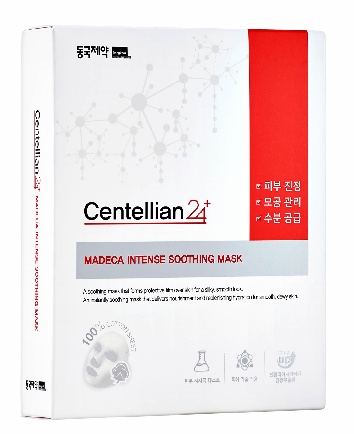 동국제약에 따르면 ‘마데카 인텐스 수딩 마스크’는 동국제약만의 특허받은 원료인 TECA(센텔라아시아티카 정량 추출물)를 함유해 건조하고 민감해진 피부에 즉각적인 수딩 및 진정 효과를 선사하는 것이 특징이다. 투명해진 TECA 에센스가 촉촉하고 빠르게 피부를 진정시켜줄 뿐 아니라 국내 마스크팩 최초로 적용된 ‘테카 샤워공법’ 기술이 유효성분의 효과적인 피부 흡수를 도와준다.