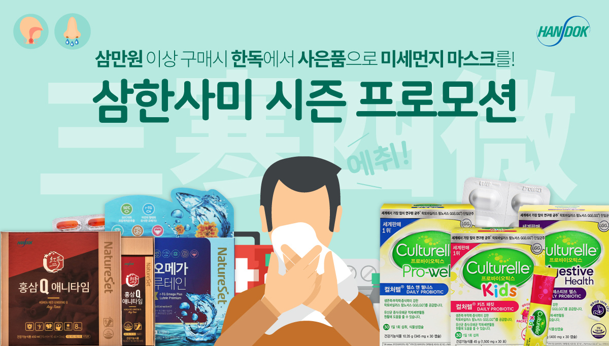 한독의 건강기능식품 전문 브랜드인 ‘네이처셋’의 ‘홍삼Q애니타임’, ‘초임계 알티지오메가플러스 루테인’을 비롯해, 세계 판매 1위  유산균 ‘컬처렐’ 제품을 3만원 이상 구입하면 1만원 당 미세먼지 마스크 1개를 증정한다.