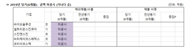 바이오솔루션, 셀트리온스킨큐어, 스킨앤스킨, 씨티케이코스메틱스, 코리아코스팩은 미공시됐다.