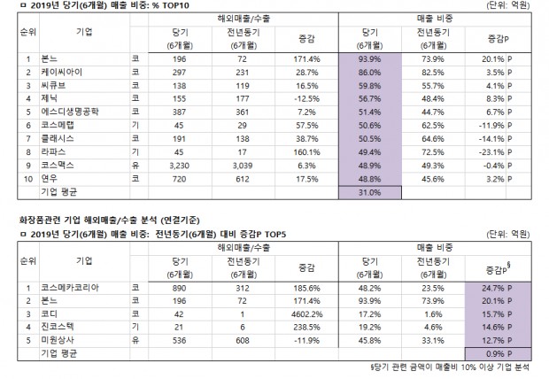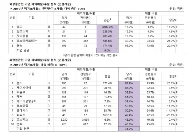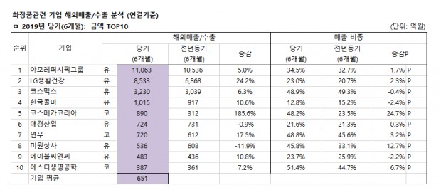 화장품신문이 관련기업 53개 해외매출·수출을 분석한 결과 아모레퍼시픽그룹이 1조1063억원으로 가장 높았고, TOP10은 LG생활건강 8533억원, 코스맥스 3230억원, 한국콜마 1015억원, 코스메카코리아 890억원, 애경산업 724억원, 연우 720억원, 미원상사 536억원, 에이블씨엔씨 483억원, 에스디생명공학 387억원 순으로 기업평균은 651억원이다.