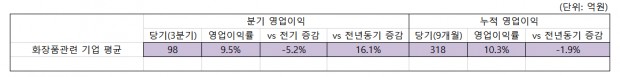 3분기 화장품 관련기업들의 영업이익은 평균 98억원으로 전년동기대비 16.1% 증가한 것으로 분석됐다.