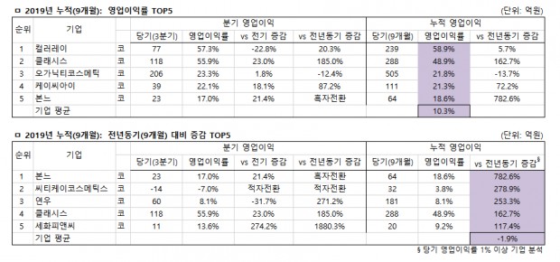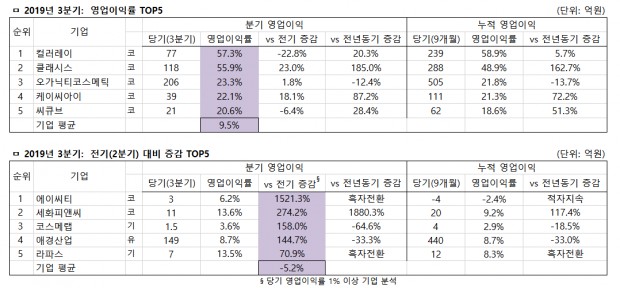 영업이익률 TOP5는 컬러레이 57.3%, 클래시스 55.9%, 오가닉티코스메틱 23.3%, 케이씨아이 22.1%, 씨큐브 20.6% 순으로 기업평균은 9.5% 증가했다.