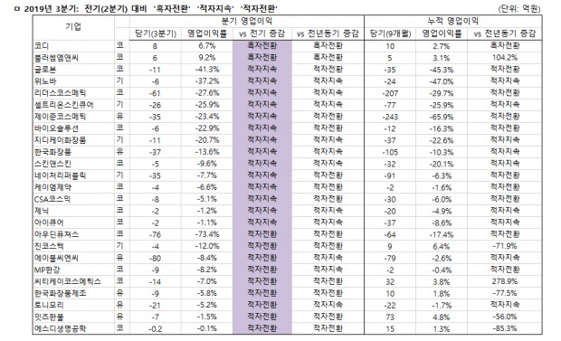 코디, 블러썸엠앤씨는 전기비 흑자전환에 성공했고, 아우딘퓨쳐스, 진코스텍, 에이블씨엔씨, MP한강, 씨티케이코스메틱스, 한국화장품제조, 토니모리, 잇츠한불, 에스디생명공학은 적자전환됐다.