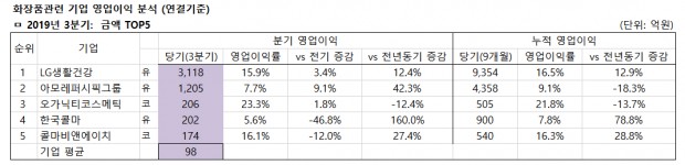 3분기 영업익 TOP5는 LG생활건강이 3,118억원으로 가장 높았으며, 아모레퍼시픽그룹 1,205억원, 오가닉티코스메틱 206억원, 한국콜마 202억원, 콜마비앤에이치 174억원 순으로 기업 평균은 98억원이다.