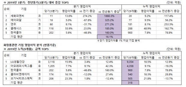 전년동기 대비 영업이익 증감 TOP5는 세화피앤씨 1880.3%, 에이피알 325.2%, 연우 271.2%, 클래시스 185.0%, 한국콜마 160.0% 순으로 기업평균은 16.1%다.