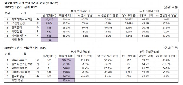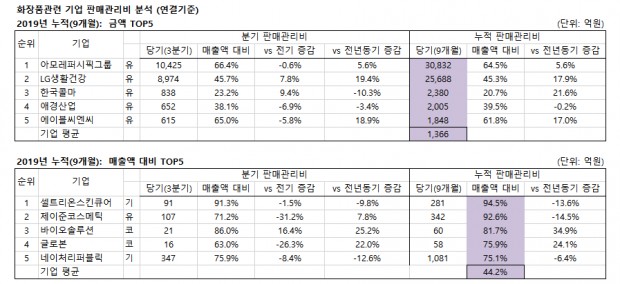 누적 판관비 TOP5는 아모레퍼시픽그룹이 3조 832억원, LG생활건강이 2조 5,688억원, 한국콜마가 2,380억원, 애경산업 2,005억원, 에이블씨엔씨 1,848억원으로 기업평균은 1,366억원이다.