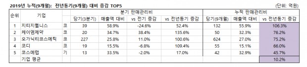지티지웰니스는 광고선전비 48억원 증가에 기인해 전년비 68억원 늘었고, 케이엠제약은 대손상각비 7억원, 급여·복리후생비 5억원 증가에 기인해 전년비 21억원 증가했다.