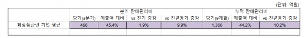 3분기 화장품 관련기업들의 판매관리비는 평균 466억원으로 전년비 9.9% 증가한 것으로 분석됐다.